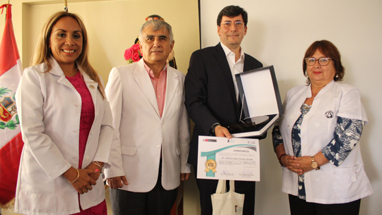 Consecutivamente, el director general de la institución, César Herrera Vidal y la jefa de la oficina de Apoyo a la Docencia e Investigación, Milagros Mendoza Barreto, le hicieron la entrega de un reconocimiento especial como: “Amigo Ilustre del Hospital Santa Rosa”.